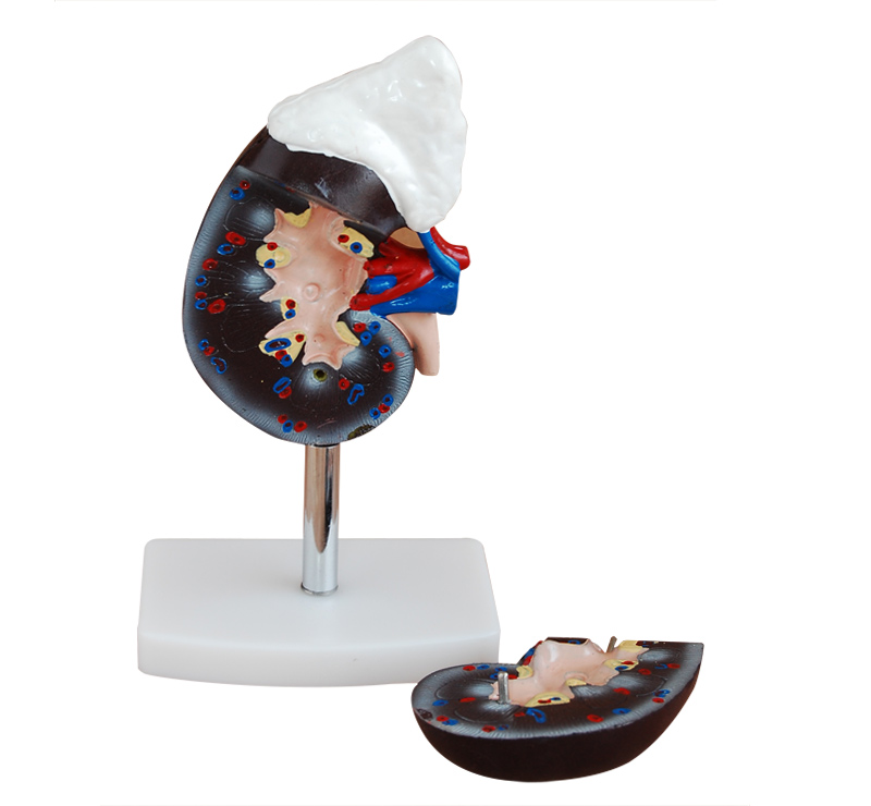 該款腎解剖附腎上腺模型可生動、直觀的顯示腎的形態和結構:腎,腎上腺,腎管和腎上腺管,輸尿管的上部等。模型可取下供仔細研究。用PVC制成,自然大小,分成2件。