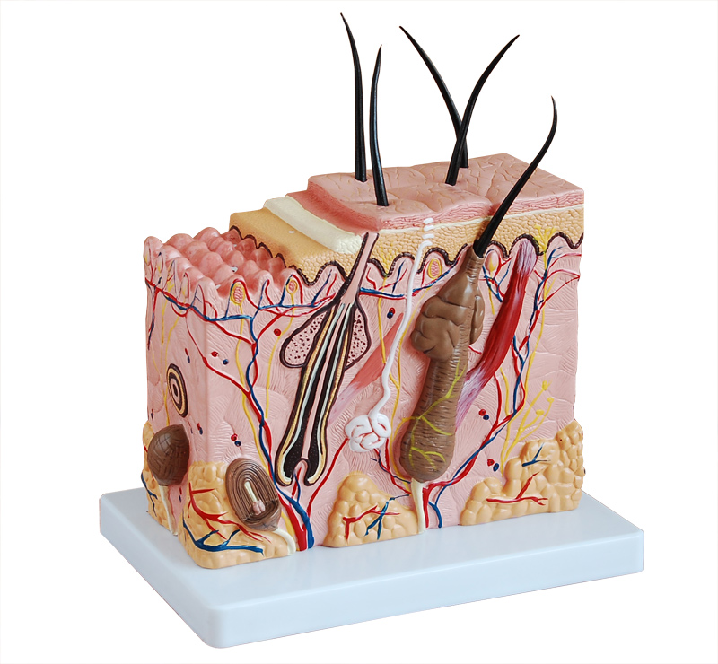 這款皮膚放大模型為人體皮膚結構的105倍擴大效果,可以直觀的展現人體皮膚的橫截面結構,清晰地顯示了皮膚、頭發毛囊、汗腺、脂肪組織等皮膚層次。模型不可分割,采用PVC材料制成,模型整體安放于塑料基座之上。