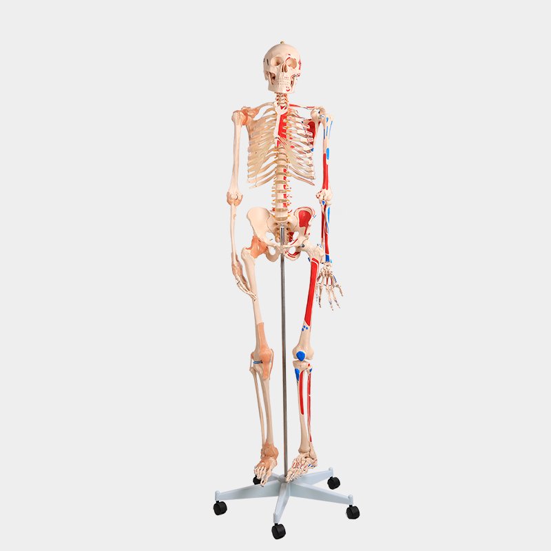 這款經濟型的、真人大小的、關節相連的塑料模型是基礎解剖教學的理想模型,手臂和腿部可拆下供研究。顯示神經分支、脊椎動脈和腰椎間盤等。頭顱含可活動的下巴、可移動的頭顱蓋、骨縫線和三顆可取下的下牙。